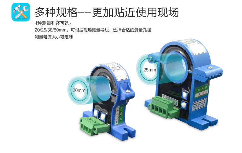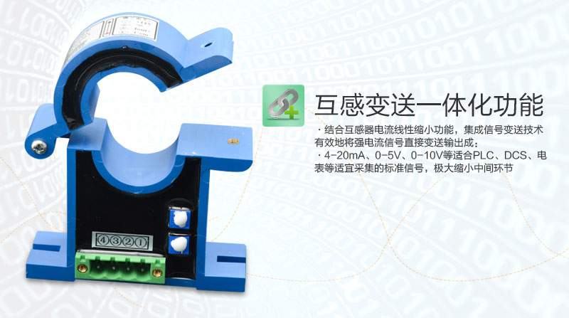 互感變送一體化功能,結(jié)合互感器電流線性縮小功能,集成信號(hào)變送技術(shù)有效地將強(qiáng)電流信號(hào)直接變送輸出4-20ma、0-5V、0-10V等適合PLC、DCS、電表等適宜采集的標(biāo)準(zhǔn)信號(hào),極大縮小中間環(huán)節(jié)