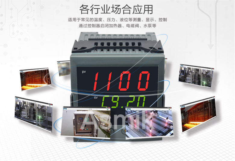 MIK-1100系列單回路數字顯示控制儀(簡易型),傻瓜式操作,0.3級測量精度,7款外型尺寸,雙四位LED顯示,可支持熱電偶、熱電阻、電壓(可開方運算)、電流(可開方運算)及變送器輸入,適用溫度、壓力、流量、液位、濕度等工業過程量的監測。支持2路報警功能,支持1路變送輸出或支持采用標準MODBUS協議的RS485通訊接口,1路DC24V饋電輸出,輸入端、輸出端、電源端光電隔離,100-240VAC/DC或20-29VDC開關電源供電,標準卡入式安裝,工作環境溫度在0-50℃,且相對濕度5-85%RH無凝結。