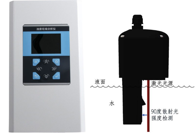 原理:濁度在線分析儀將一束激光,從空氣中,按垂直于水面的方向,射入水中。激光被水中的懸浮顆粒散射,水中的傳感器檢測(cè)出與入射光成90 度方向的散射光強(qiáng)度,并根據(jù)校準(zhǔn)表,將散射光強(qiáng)度換成成為濁度值。